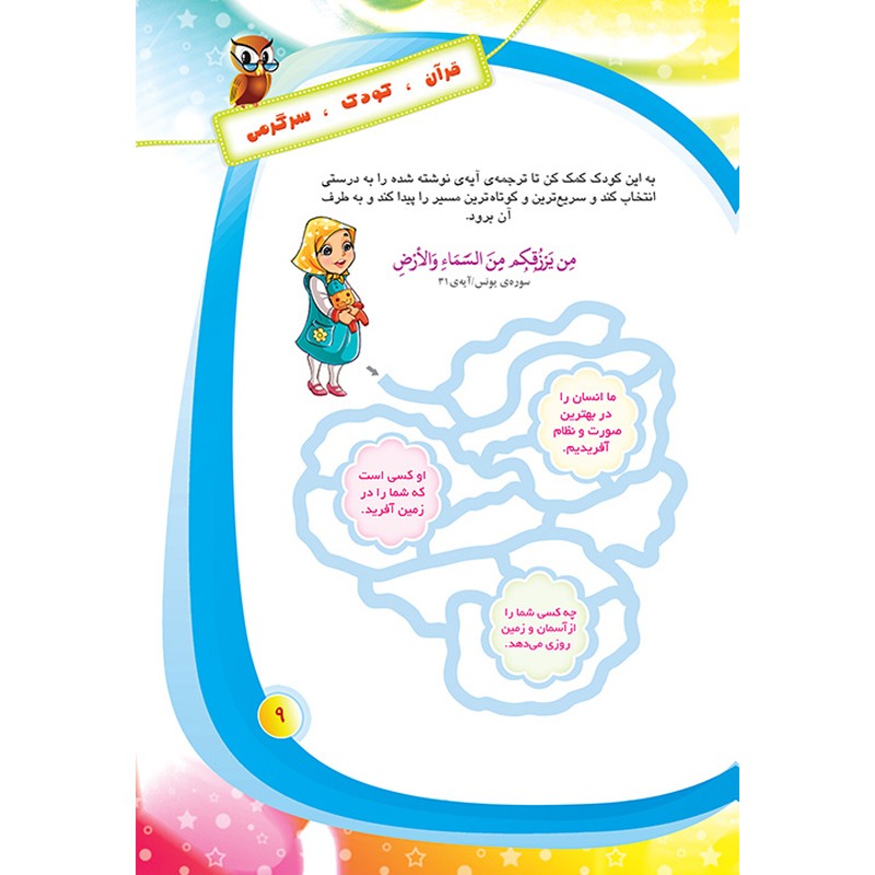 - آموزش مفاهیم قرآنی: هر کدام از سرگرمیهای موجود در کتاب با یک مفهوم قرآنی همراه است. برای مثال، کودک با حل هر بازی، با نکات اخلاقی، اعتقادی یا دینی قرآن آشنا میشود. این روش کمک میکند که مفاهیم قرآنی بهطور غیرمستقیم و جذاب در ذهن کودکان تثبیت شوند.
