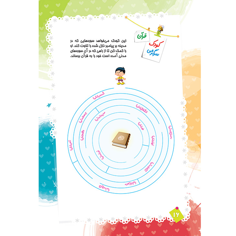 - آموزش مفاهیم قرآنی: هر کدام از سرگرمیهای موجود در کتاب با یک مفهوم قرآنی همراه است. برای مثال، کودک با حل هر بازی، با نکات اخلاقی، اعتقادی یا دینی قرآن آشنا میشود. این روش کمک میکند که مفاهیم قرآنی بهطور غیرمستقیم و جذاب در ذهن کودکان تثبیت شوند.