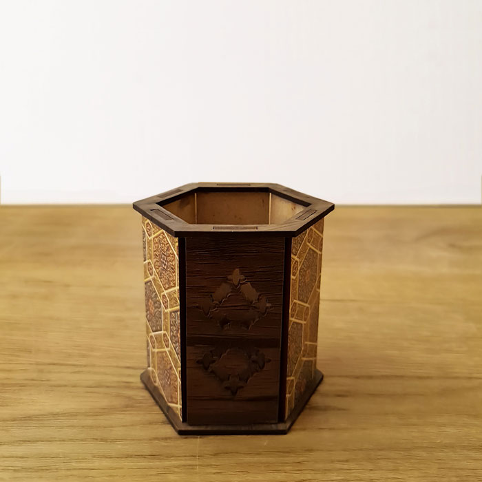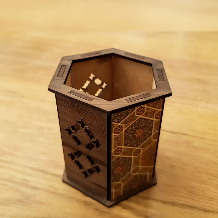 جامدادی چوبی با طراحی ششضلعی و چوبی با نقشهای سنتی، یک گزینه زیبا و کاربردی برای نظمدهی به میز کار یا تحریر شماست. اندازه این جامدادی برای نگهداری سایر لوازم نوشتاری ایدهآل است.